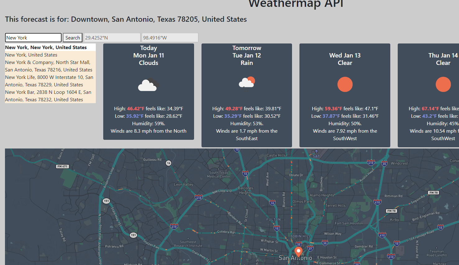 This is a fully responsive, fully interactive, mobile responsive Javascript app - it even has a hand-coded autocomplete function on the search bar. It uses jQuery, Bootstrap, AJAX, vanilla Javascript, and CSS and HTML.